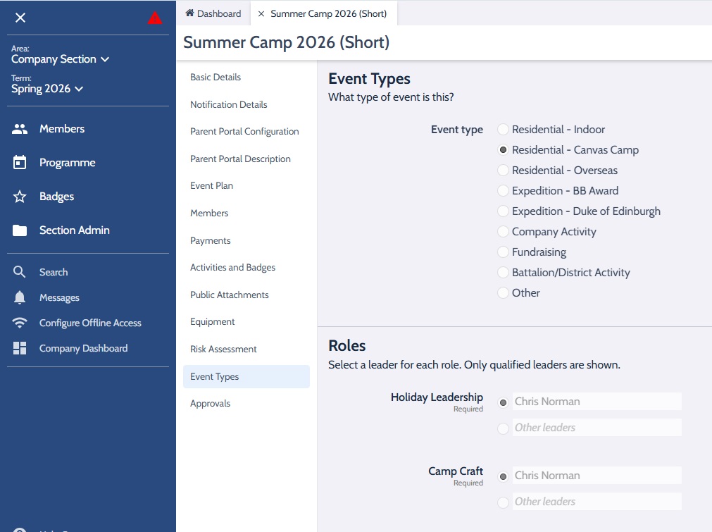 If you create all Camps/Holidays as Events in OBM and complete the required fields to approve the camp/holiday you do not need to send a separate notification in to BB Headquarters. You can select leaders responsible for Holiday Leadership and Camp Craft as required as well as provide all mandatory information.
