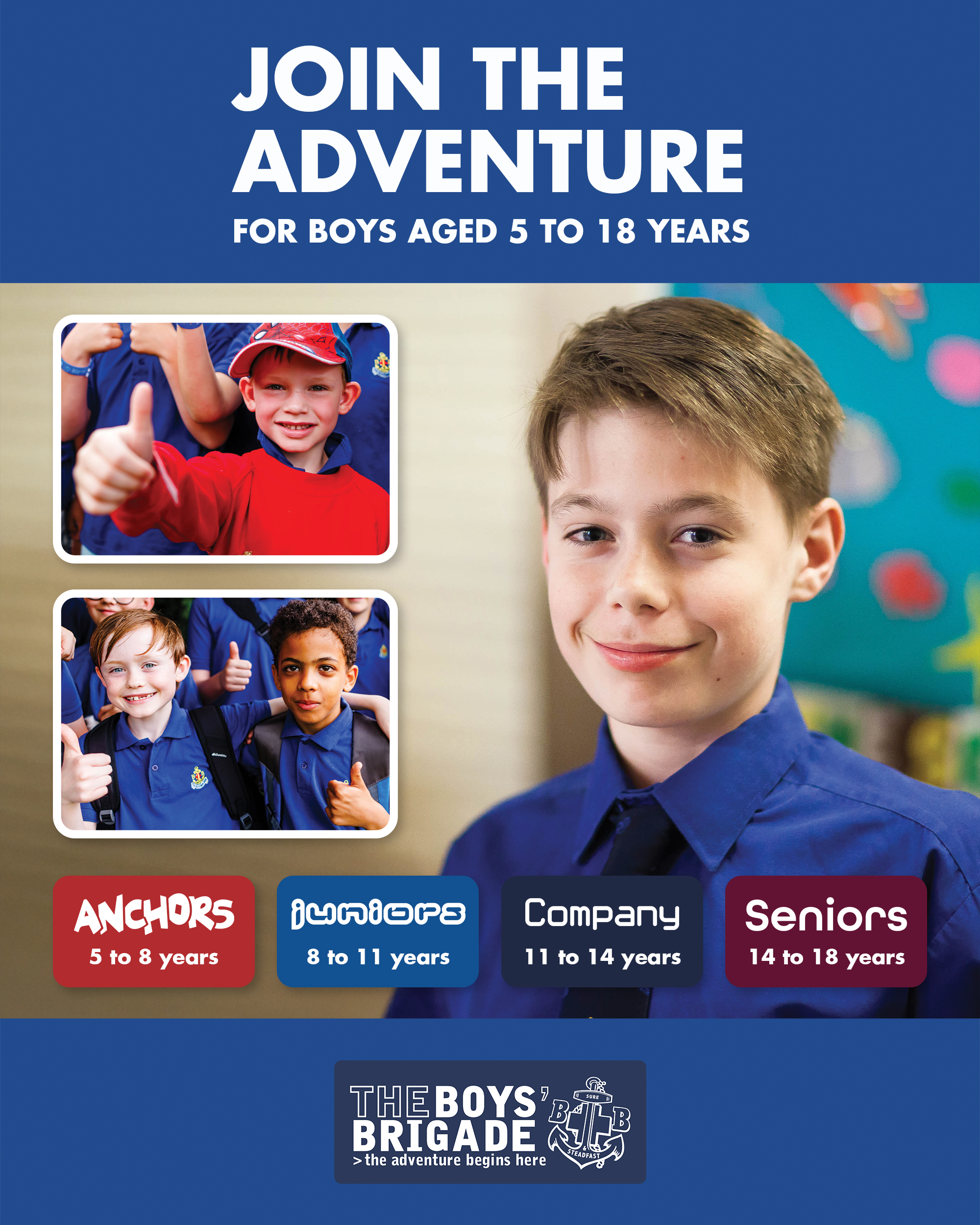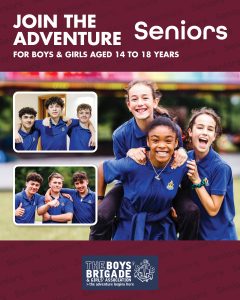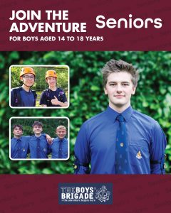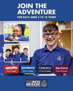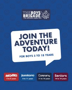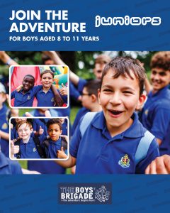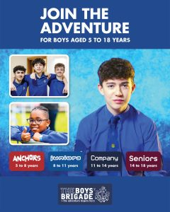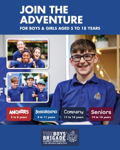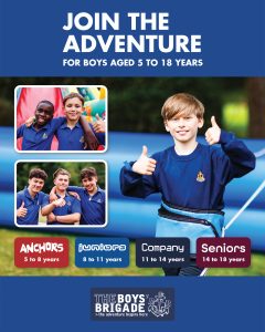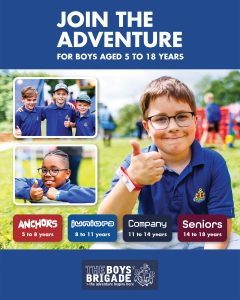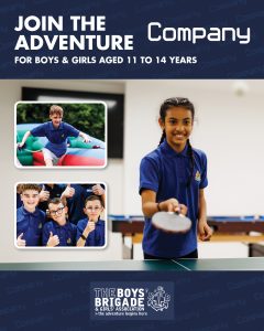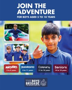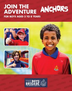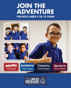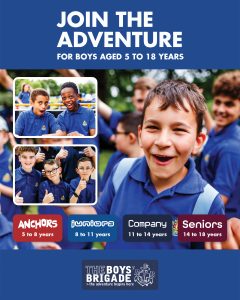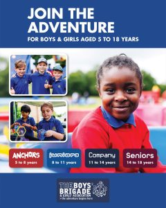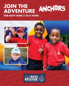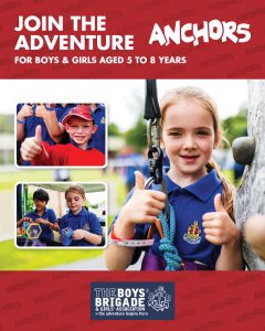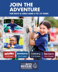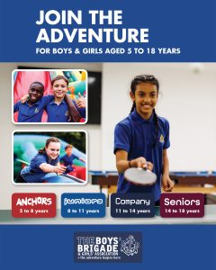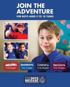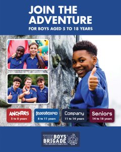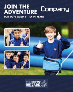 The design signposts boys-brigade.org.uk/join/ and the ‘Find a Group’ tool. There are versions of the designs with all age groups and also separate designs for Under 11s (Anchors & Juniors) and Over 11s (Company & Seniors). There are also some designs which are boys only and others which feature boys & girls featuring Girls’ Association branding. You can find out more about getting these resources printed by clicking here.