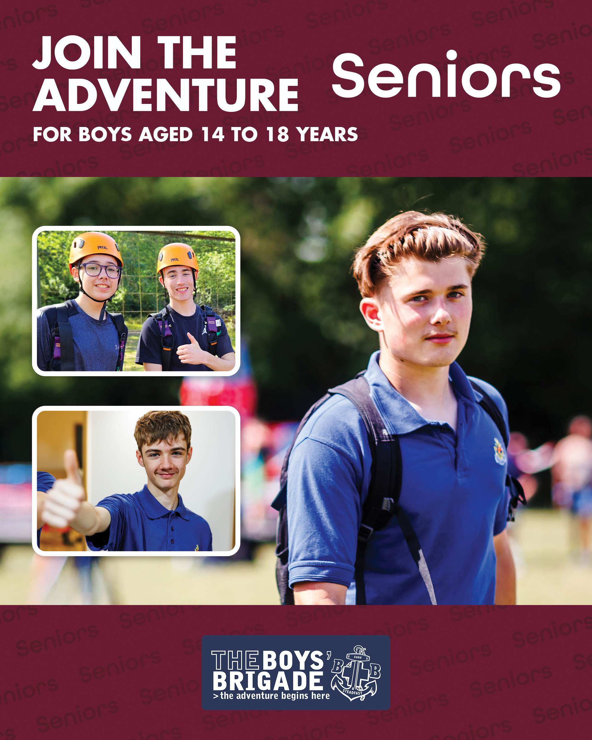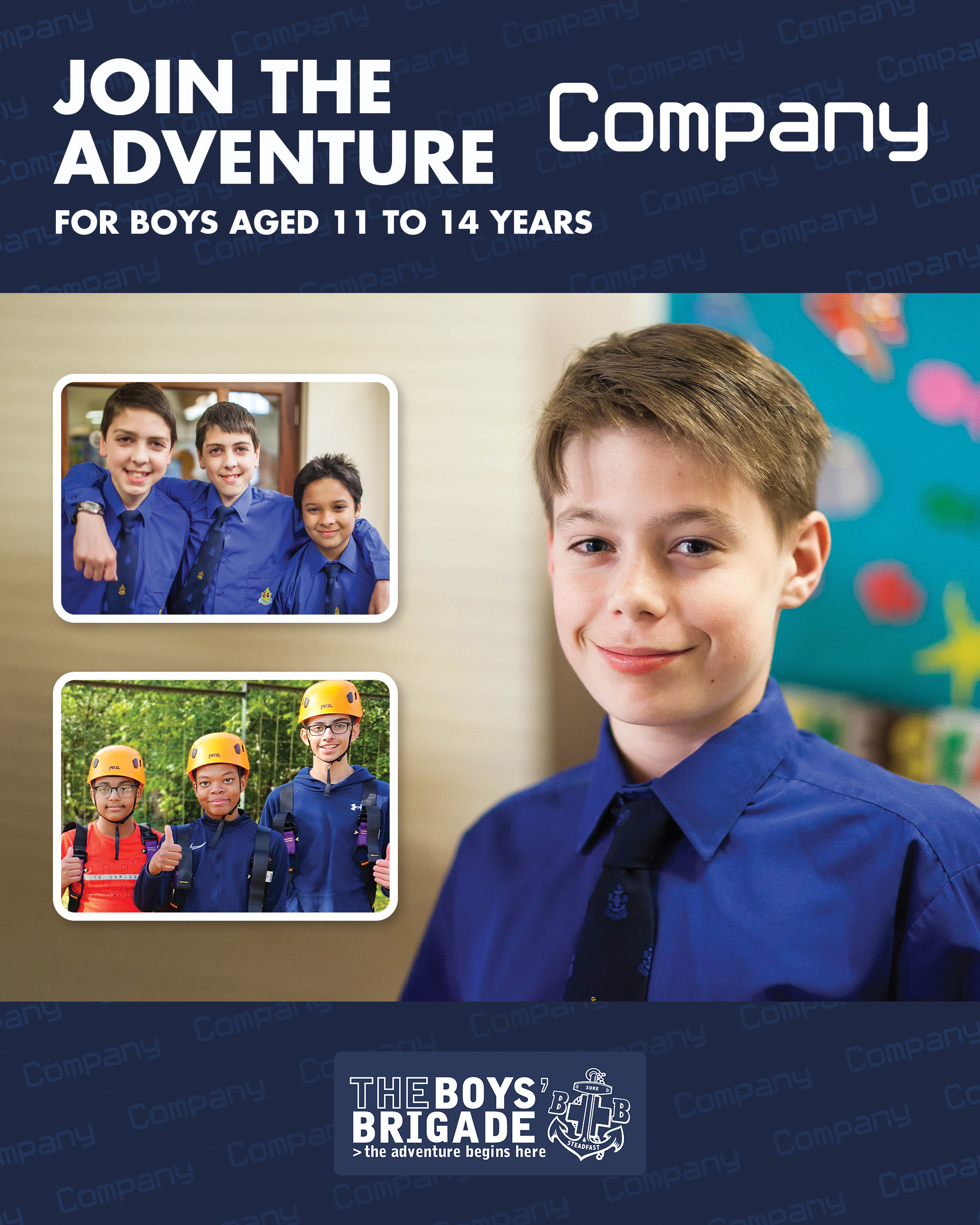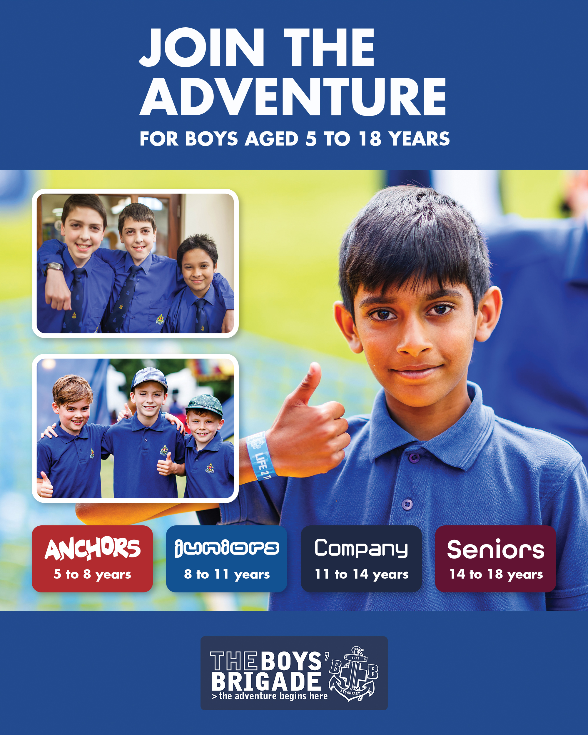 The design signposts boys-brigade.org.uk/join/ and the ‘Find a Group’ tool. There are versions of the designs with all age groups and also separate designs for Under 11s (Anchors & Juniors) and Over 11s (Company & Seniors). There are also some designs which are boys only and others which feature boys & girls featuring Girls’ Association branding. You can find out more about getting these resources printed by clicking here.